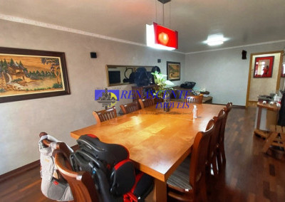 Sala ampla para dois ambientes, de aproximadamente 30 metros quadrados, onde temos uma mesa de bilhar/snooker, que também é uma mesa de jantar, para 10 lugares.