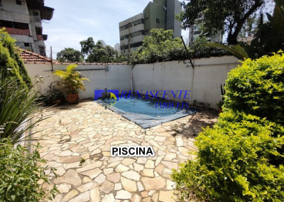 Conta com piscina na parte frontal e garagem para até 2 veículos (sendo 1 vaga coberta), dispostas em fila.